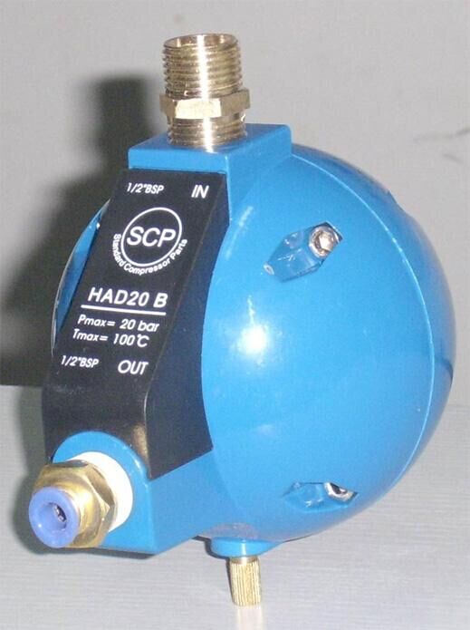 | 水在排水器里累積,達(dá)到一定水位之后,浮力大于空氣壓力,空氣瓶上浮,排水口打開,水在氣壓作用下排出,同時浮力減小,空氣瓶下降堵住排水口。